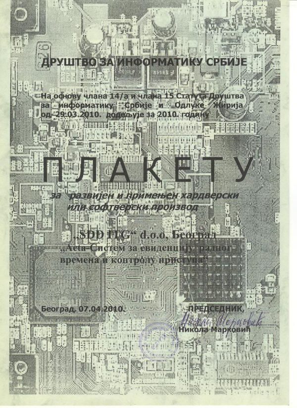 Predsednik Društva za informatiku Srbije (DIS) Nikola Marković svečano je danas u Privrednoj komori Srbije uručio priznanja za izvanredna dostignuća u oblasti informacionih tehnologija za 2010. godinu, uz prezentaciju nagrađenih radova. Priznanje za razvijeni primenjeni hardverski ili softverski proizvod pripalo… Continue Reading →